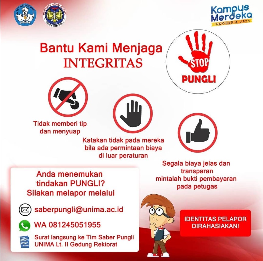 2. Tenaga Pendidik dan Tenaga Kependidikan dilarang menerima gratifikasi dalanm bentuk apapun dan dalam melakukan pelayanán kepada mahasiswa dan pihak lainnya tidak dibenarkan melakukan pungutan diluar ketentuan yang berlaku di Unima.