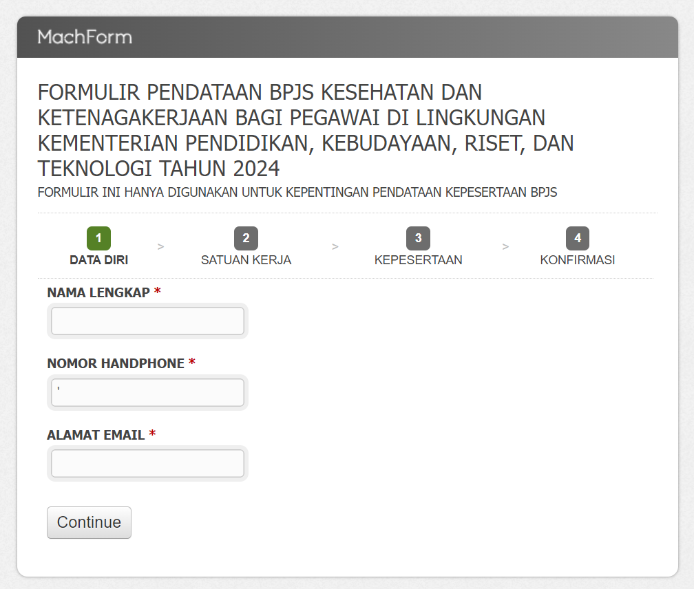 FORMULIR PENDATAAN BPJS KESEHATAN DAN KETENAGAKERJAAN BAGI PEGAWAI DI LINGKUNGAN KEMENTERIAN PENDIDIKAN, KEBUDAYAAN, RISET, DAN TEKNOLOGI TAHUN 2024 DAPAT DIAKSES PADA LINK DIBAWAH INI : https://bit.ly/4bypD2Y