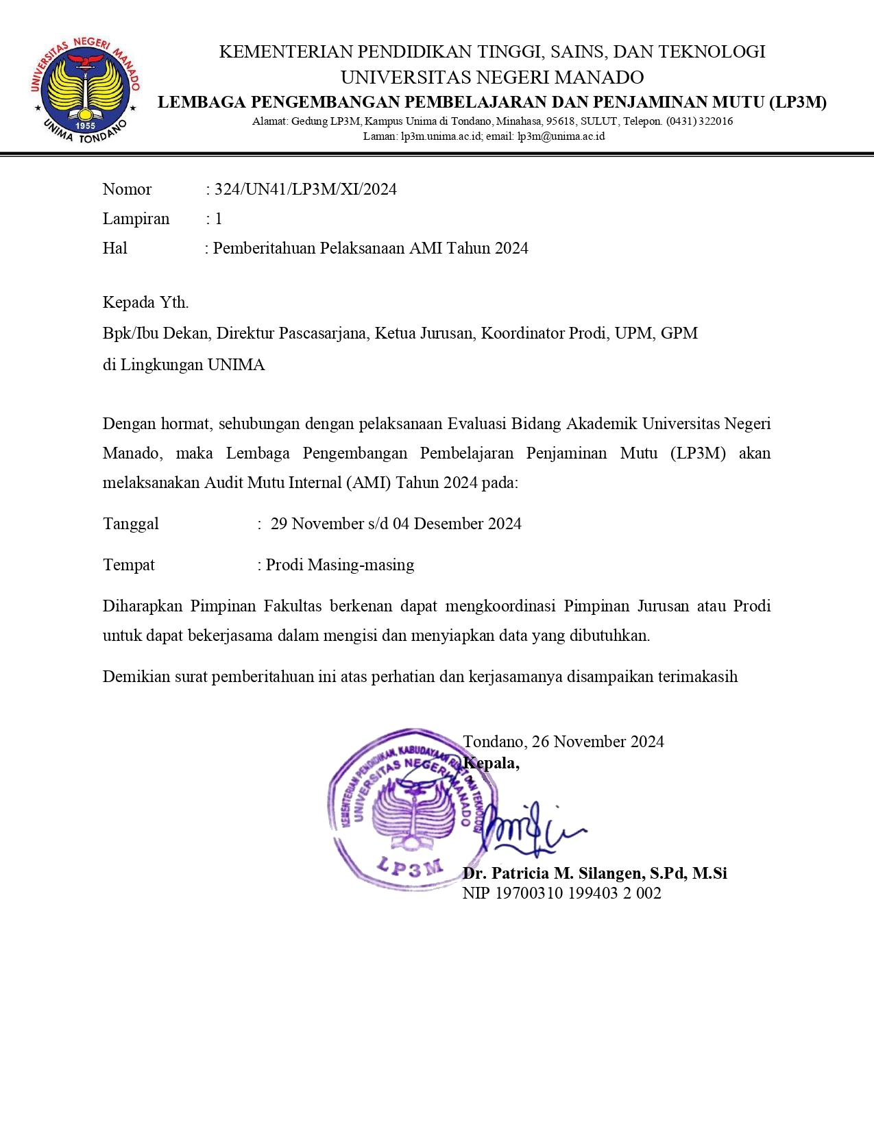 Dengan hormat, sehubungan dengan pelaksanaan Evaluasi Bidang Akademik Universitas Negeri Manado, maka Lembaga Pengembangan Pembelajaran Penjaminan Mutu (LP3M) akan melaksanakan Audit Mutu Internal (AMI) Tahun 2024. Lampiran Surat Dapat dilihat dibawah ini