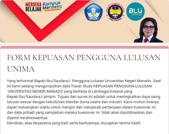 Yang terhormat Bapak/Ibu/Saudara/i Pengguna Lulusan Universitas Negeri Manado. Saat ini kami sedang mengumpulkan data Tracer Study KEPUASAN PENGGUNA LULUSAN UNIVERSITAS NEGERI MANADO yang berkerja di Lembaga/Instansi yang Bapak/Ibu/Saudara/i pimpin. Tujuan dari survei ini adalah untuk meningkatkan daya saing lulusan sesuai dengan kebutuhan/standar dunia usaha dan industri. Kami mohon kiranya dapat meluangkan waktu untuk mengisi dan menjawab pertanyaan dalam kuesioner ini, dan data pribadi yang sampaikan melalui kuesioner ini tidak akan dipublikasikan dan dijamin kerahasiaannya.