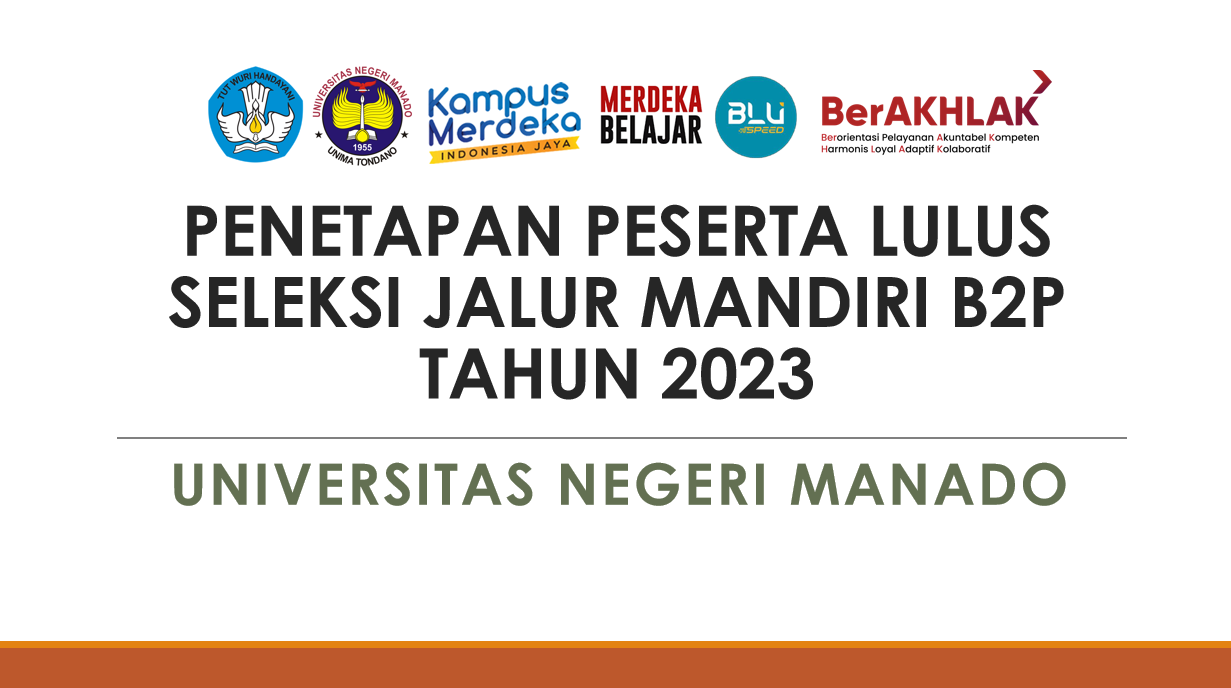 Penetapan Peserta Lulus Seleksi Jalur Mandiri Baku Beking Pande (B2P) Tahun 2023 pada Universitas Negeri Manado
