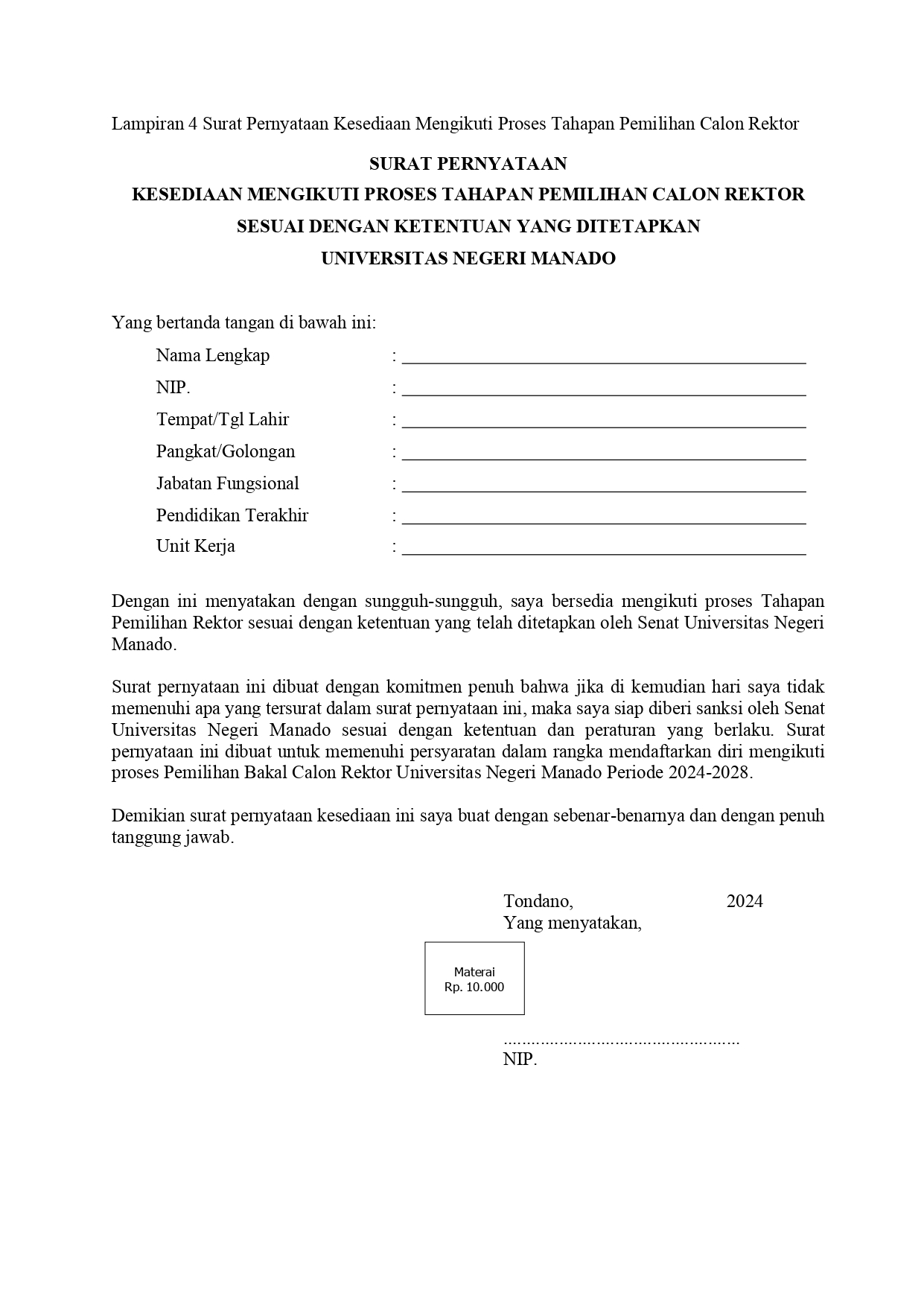 Pengumuman Pendaftaran Bakal Calon Rektor Unima Periode 2024-2028