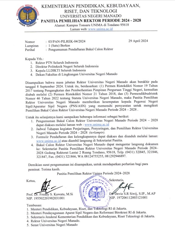 Pengumuman Pendaftaran Bakal Calon Rektor Universitas Negeri Manado