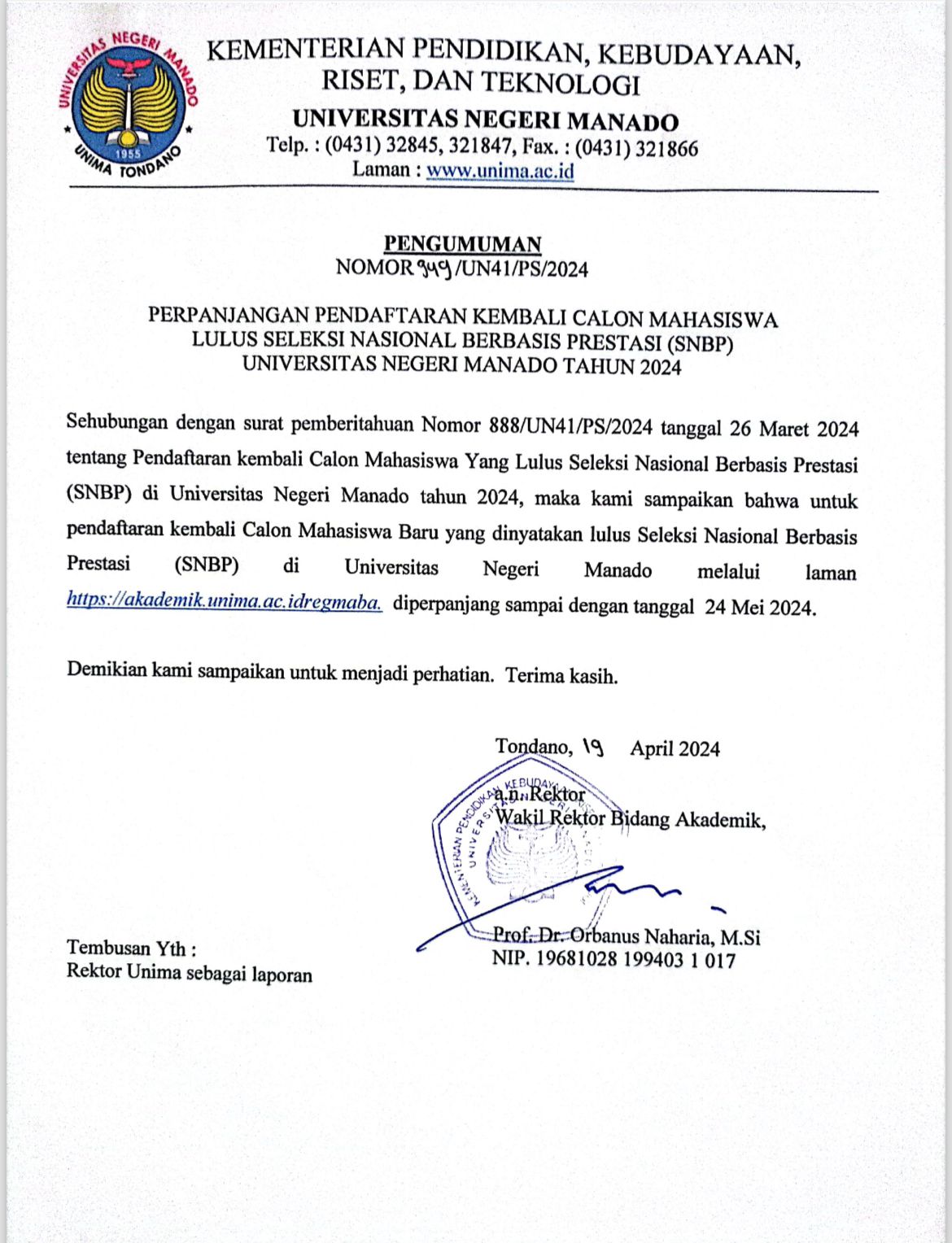 Pengumuman Perpanjangan Pendaftaran Mahasiswa Baru Jalur SNBP Tahun 2024