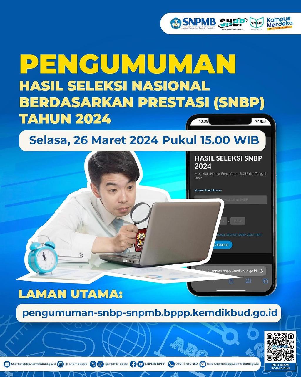 Segenap panitia SNPMB mengucapkan selamat kepada peserta SNBP Tahun 2024 yang dinyatakan lulus seleksi Jalur SNBP. Kepada peserta yang belum lulus SNBP untuk tidak berkecil hati karena masih mempunyai kesempatan untuk mengikuti Ujian Tulis Berbasis Komputer (UTBK) dalam Seleksi Nasional Berdasarkan Tes (SNBT) Tahun 2024. Pendaftaran UTBK-SNBT Tahun 2024 dibuka sampai dengan 5 April 2024.
