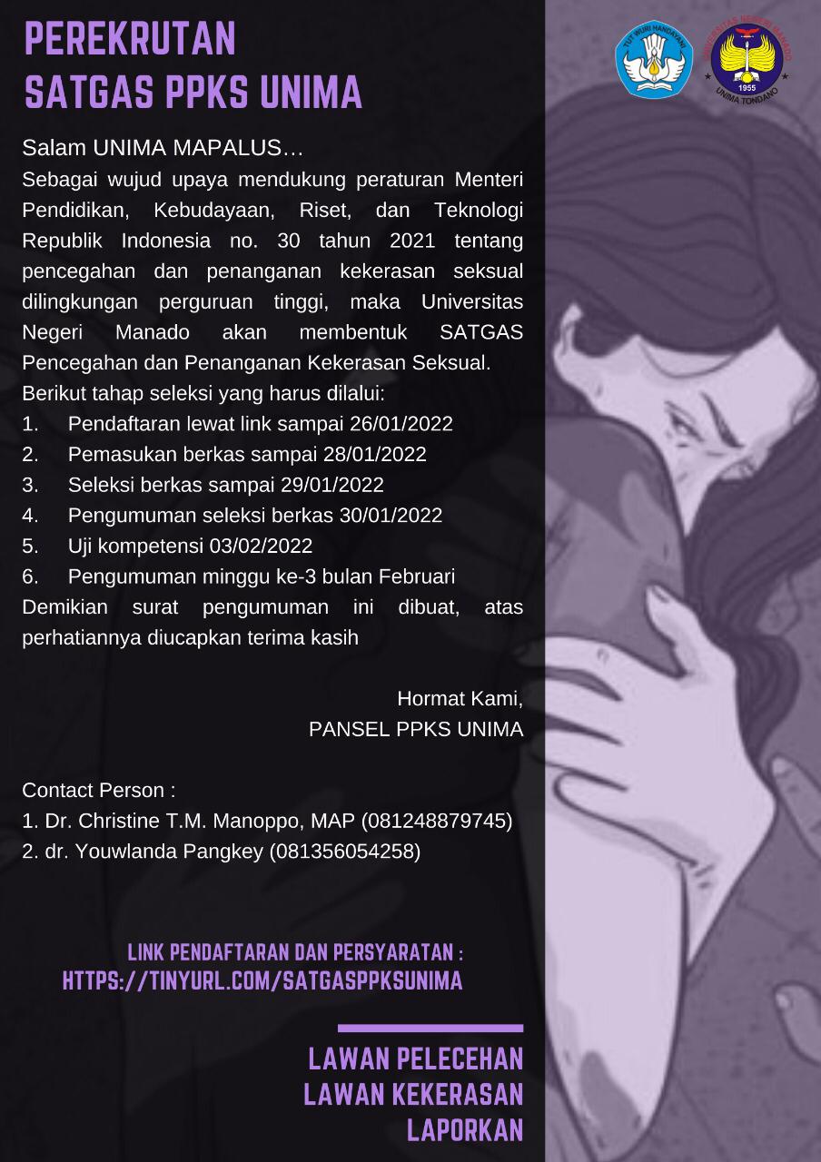 Sebagai wujud upaya mendukung Perekrutan Mendikbudristek RI No. 30 Tahun 2021, maka dibentuklah Satgas Pencegahan dan Penanganan Kekerasan Seksual di lingkungan Universitas Negeri Manado dengan Tahapan dan Prosedur sesuai yang tercantum.