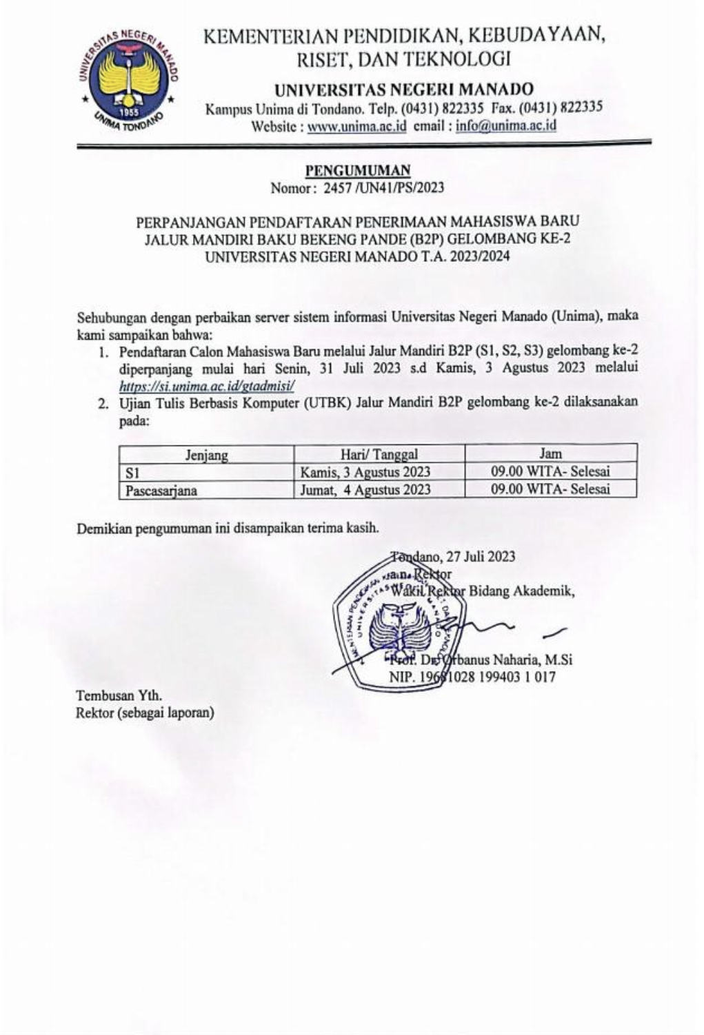 Perpanjangan Penerimaan Mahasiswa Baru Jalur B2P 2023
