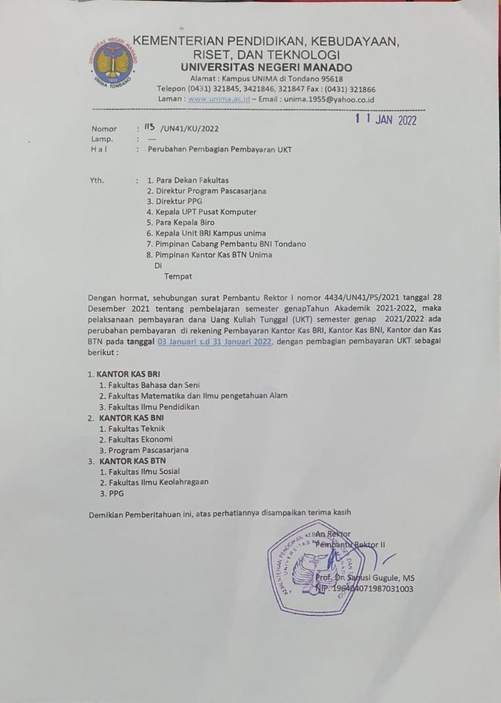 Perubahan Pembagian Bank Pembayaran UKT Semester Genap TA 2021/2022