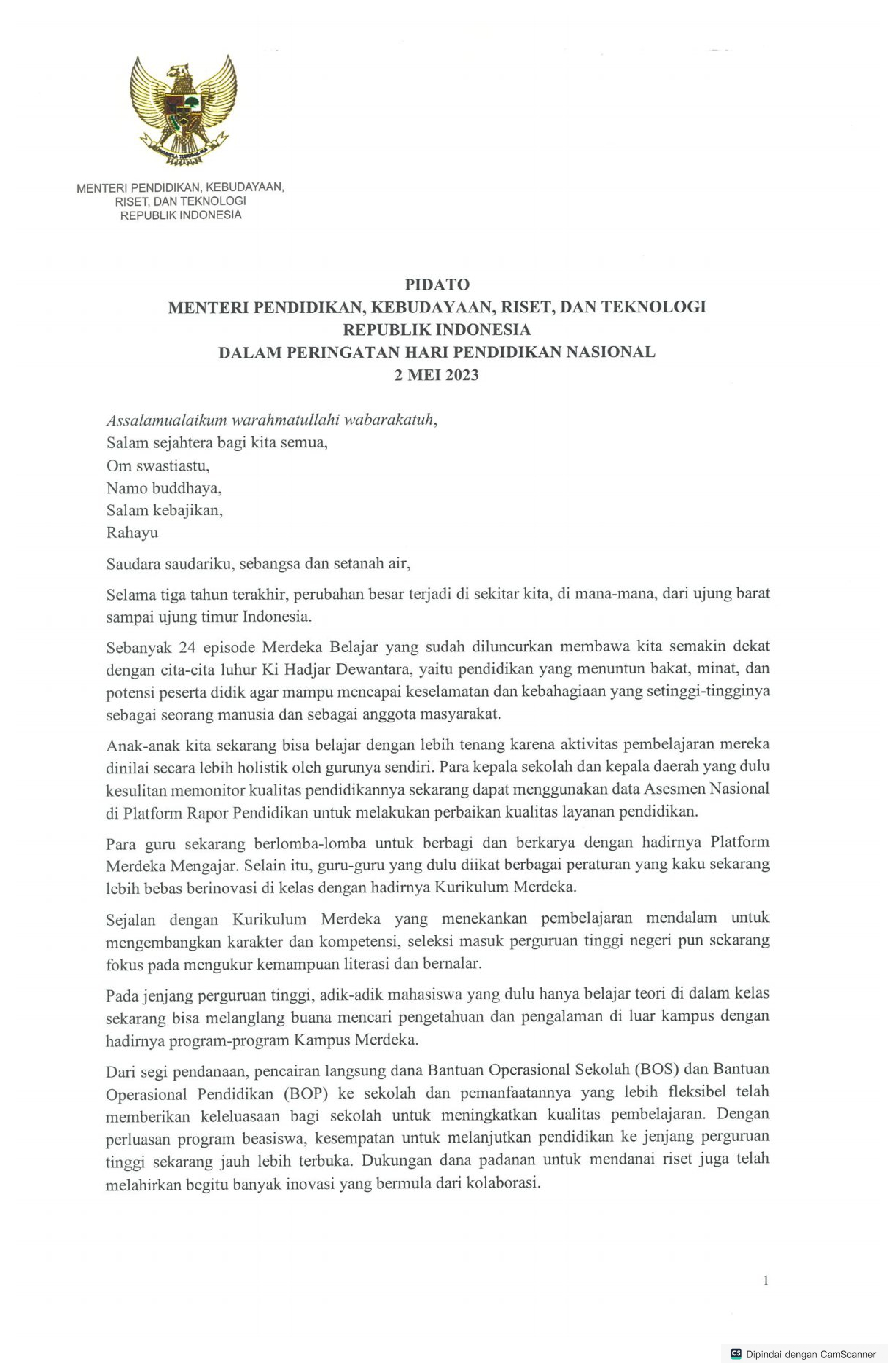 Pidato Mendikbudristek dalam rangka Hari Pendidikan Nasional Tahun 2023