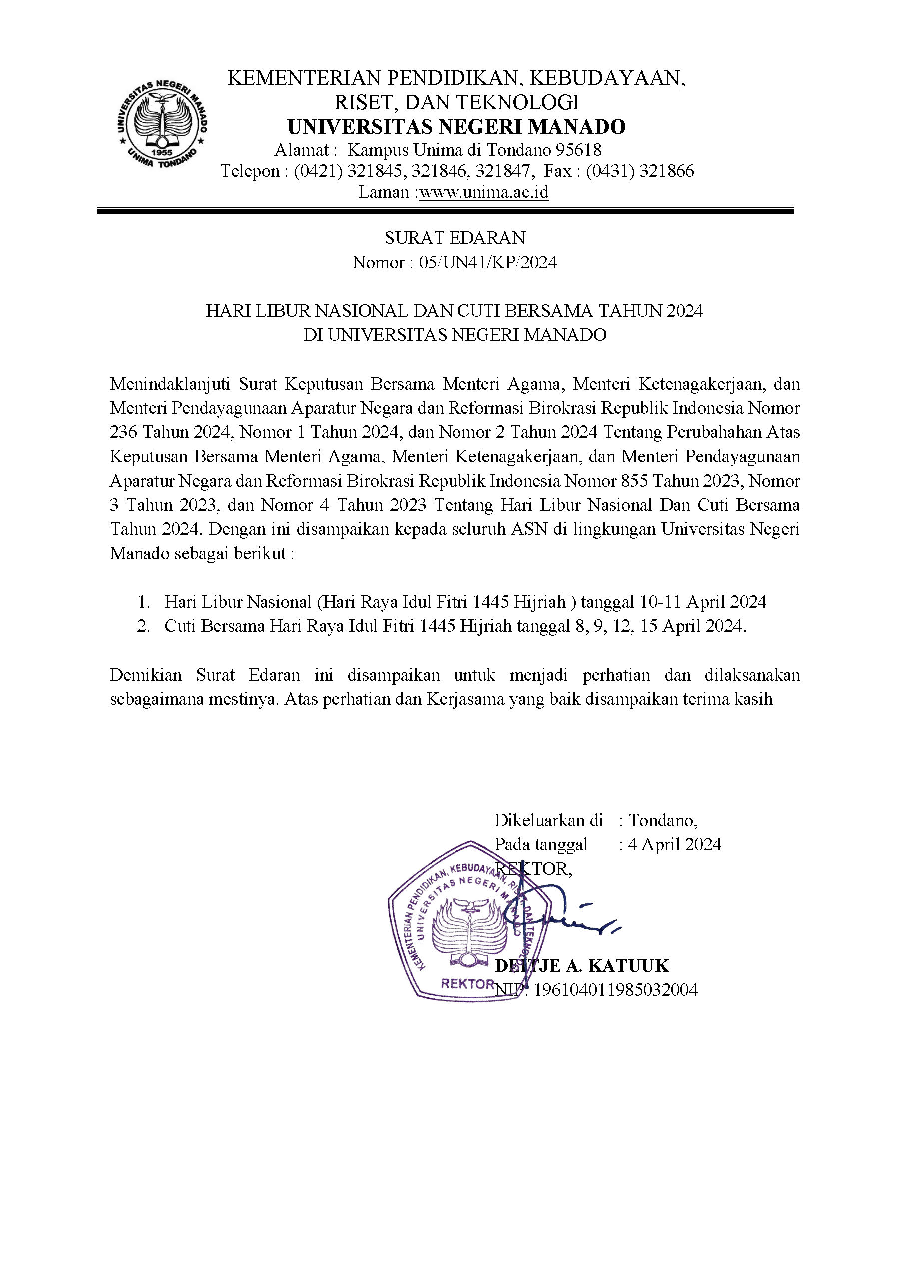 Surat Edaran Hari Libur Nasional dan Cuti Bersama Tahun 2024 Universitas Negeri Manado