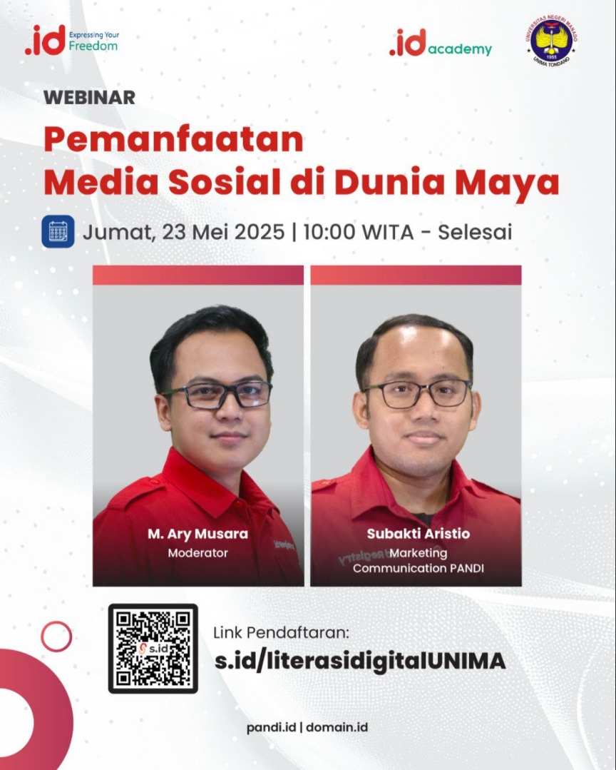 Kepada seluruh mahasiswa, dosen, dan pegawai Universitas Negeri Manado, kami mengundang Anda untuk mengikuti serangkaian kegiatan Webinar dan Workshop Literasi Digital hasil kerja sama antara UPA TIK UNIMA dan PANDI (Pengelola Nama Domain Internet Indonesia).