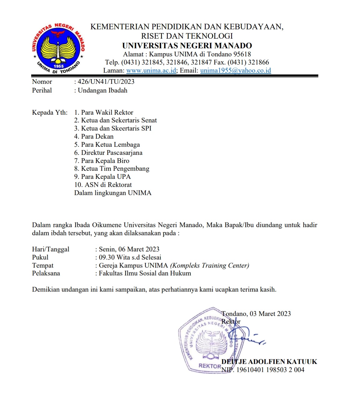 Undangan Ibadah Bersama Senin, 06 Maret 2023